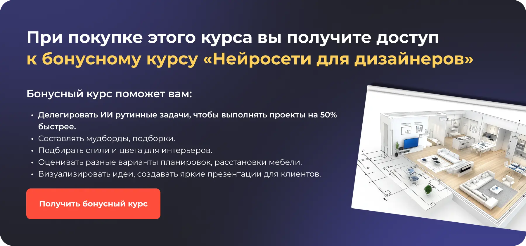 Получите все необходимые знания и навыки для старта в профессии, выполните реальный проект интерьера, освойте 3D-визуализацию и начните зарабатывать на дизайне